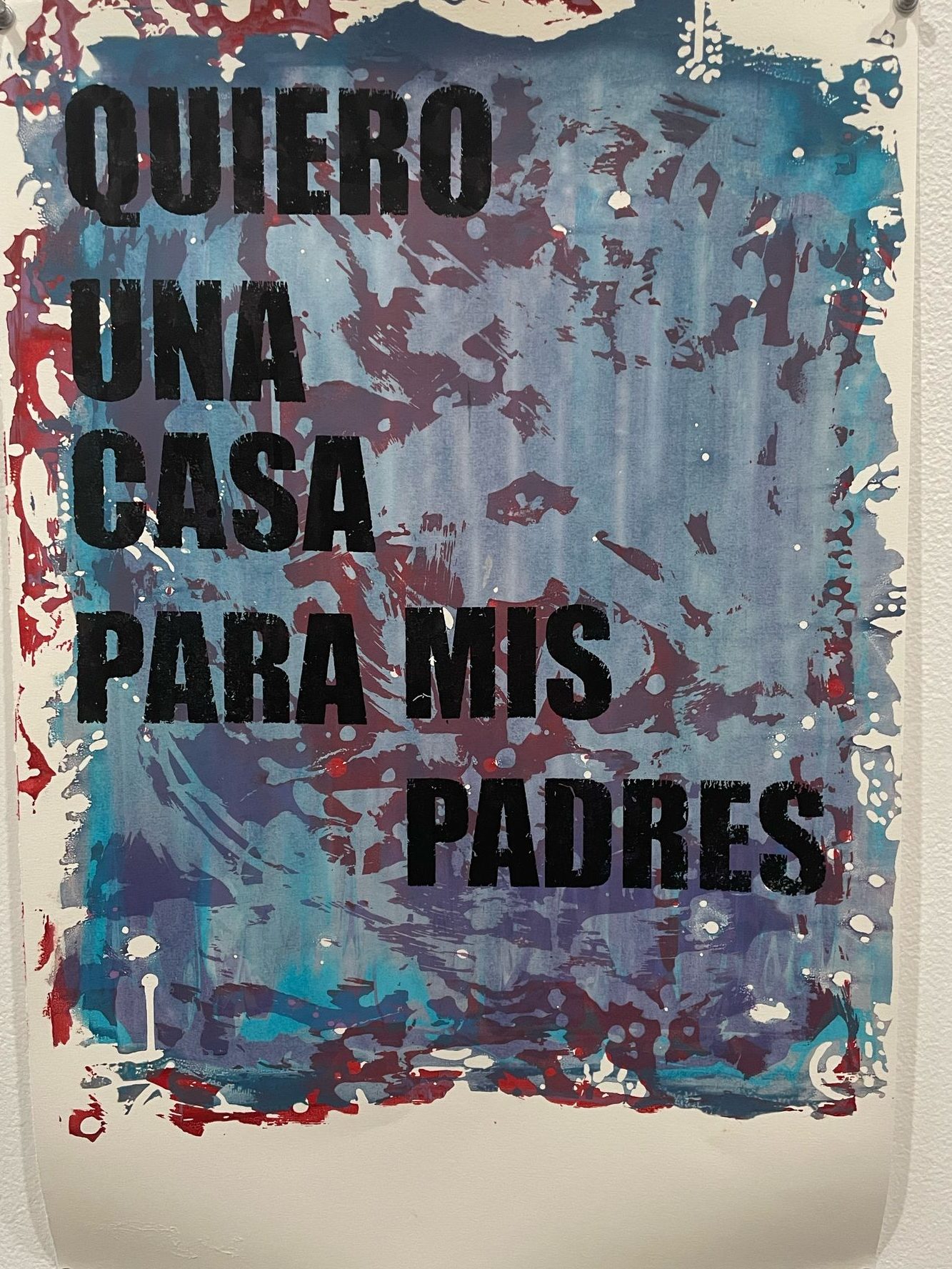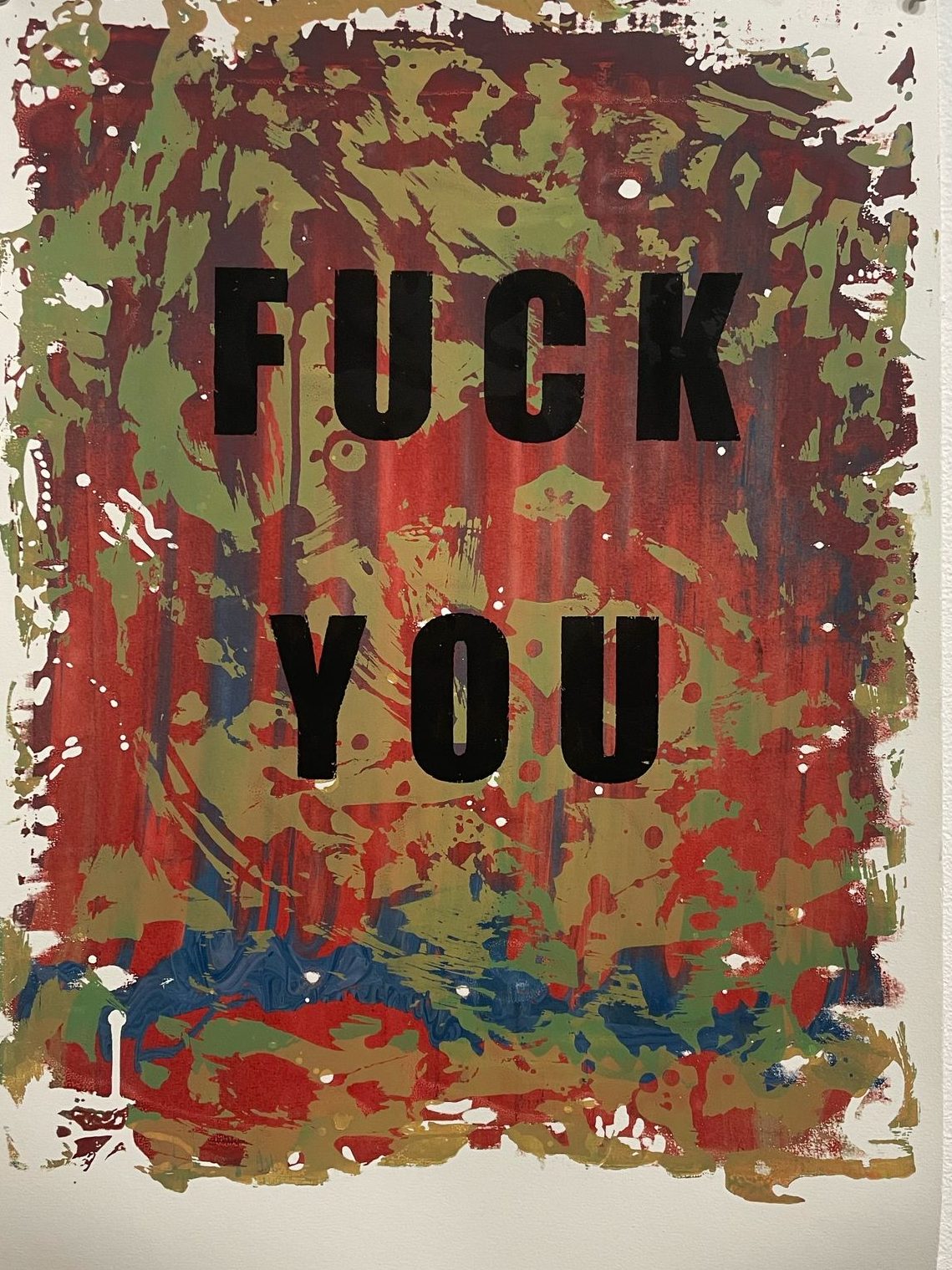 Printmaking, like words shouted, has the ability to connect with people through repetition and accessibility. Screenprinting was beneficial to the intentions of this piece because of its quick, painterly, and impactful nature. Mimicking people’s need to express their concerns to their nation leaders, abstraction and bold words come together, like a scream one should not shy away from.